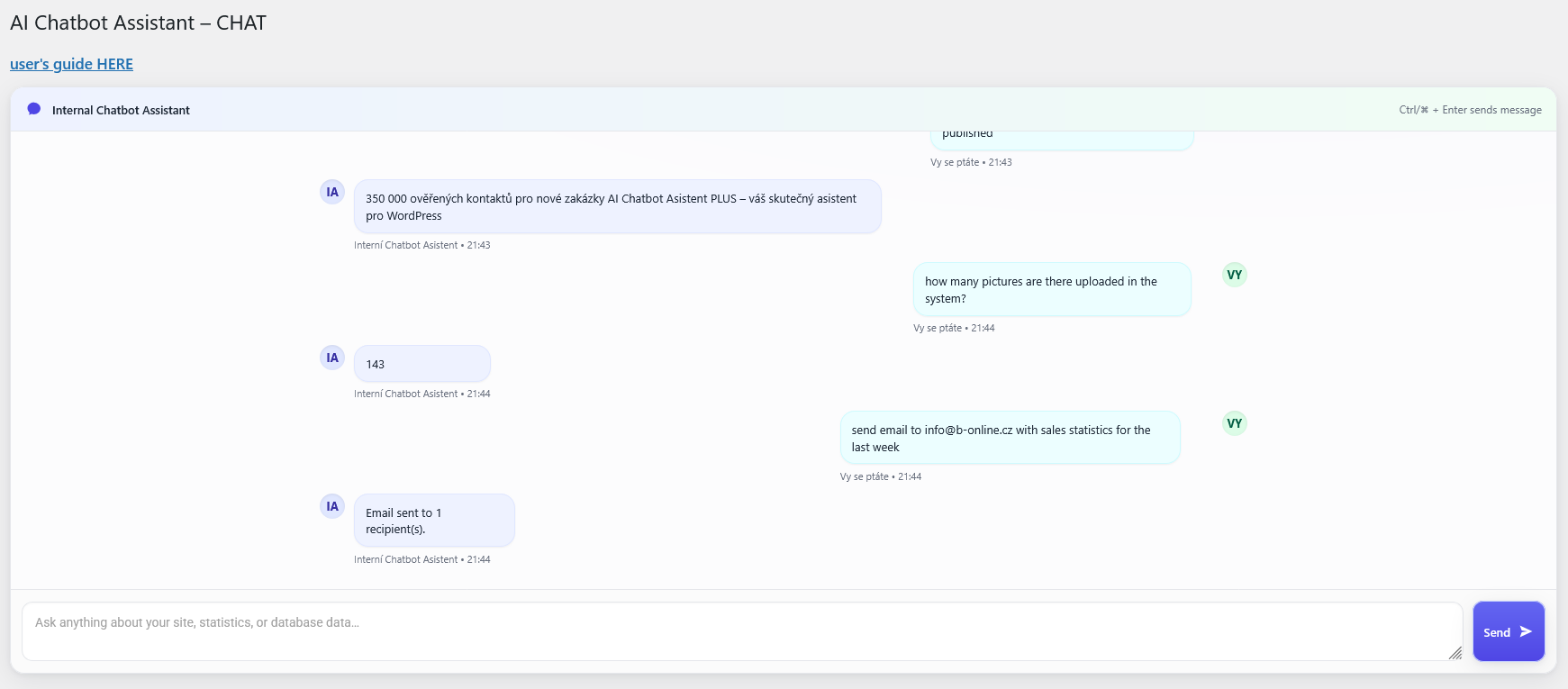 Example: “Increase the price of product XYZ by 5%, send me weekly sales stats, and draft an email to customers.” — AI Chatbot Assistant PLUS will handle it—clearly, in Czech, and safely.